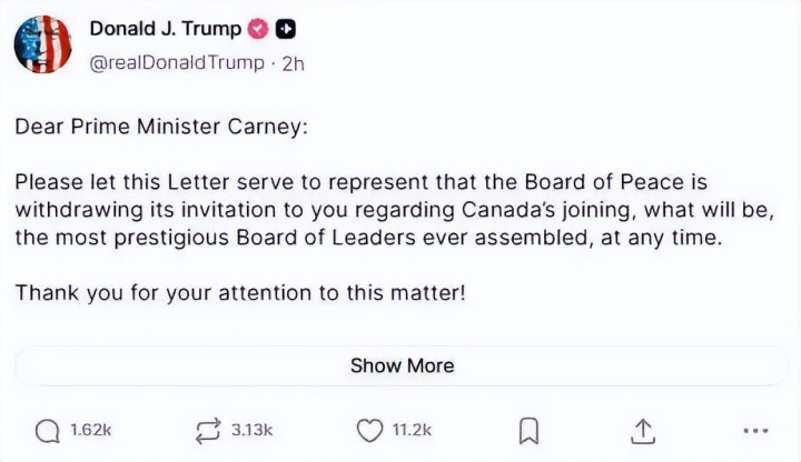 除此之外,他还专门发了两条推文,第一条就是告知加拿大总理卡尼,撤回之前邀请加拿大加入“和平委员会”的邀请。